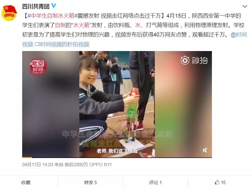 4月11日,抖音自媒体@西安就是帅 发布视频《水火箭一飞冲天》,再现了西安市第一中学春季田径运动会期间,阳光体育文化项目展演水火箭发射表演。截止4月13日,视频发布三天阅读量达1013万次,获赞38.8万次。截止4月20日,视频已获赞47.2万次。网络爆红后,引发数十家媒体集体“围观”……